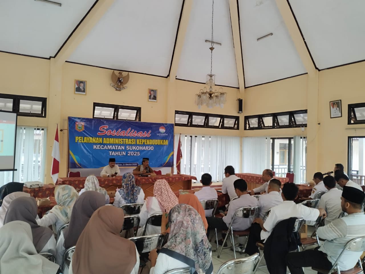Kecamatan Sukoharjo menyelenggarakan kegiatan Sosialisasi Pelayanan Administrasi Kependudukan pada Rabu, 22 Oktober 2025 di Pendopo Sasana Karaharjan Kecamatan Sukoharjo. Acara diikuti oleh Kepala Desa, Sekretaris Desa, dan Admin Desa se Kecamatan Sukoharjo. Acara dibuka langsung oleh Sekretaris Kecamatan Bapak Sobarudin,S.IP,MM. Dalam sambutannya ditegaskan bahwa "Pelayanan kepada masyarakat merupakan ujung tombak transformasi birokrasi untuk itu mari bersama meningkatkan pelayanan agar tercipta transformasi birokrasi yang berintegritas." Acara dilanjutkan dengan paparan materi oleh Bapak Setyo Haryanto selaku Kasubbag PATEN Sukoharjo.